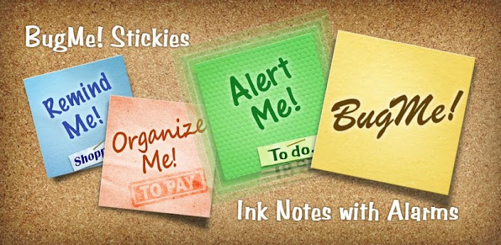 Its time to bring your yellow sticky postit notes up to date - BugMe! brings all the fun and flexibility of the handy little notes right to your smartphone or tablet. Pin them to a virtual cork board within the app and set alarms and alerts, or use the BugMe! Widget to “Stick” your note on your launcher screen for that extra visual reminder!